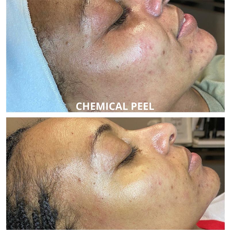 A technique used to improve the appearance of the skin on the face, neck or hands. A chemical solution is applied to the skin that causes it to exfoliate and eventually peel off. The new, regenerated skin is usually smoother and less wrinkled than the old skin. Your esthetician can determine the best peel for you!