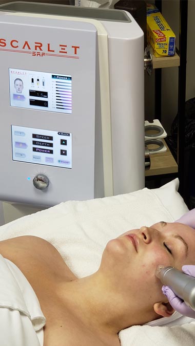 Deep micro-needling radio frequency technology used to tighten skin and improve texture. Frequent treatments with Scarlet can help improve fine lines, wrinkles and crepiness, and help prevent the need for early face face and neck lifting. Heat is introduced into the skin through controlled needle punctures without damaging the skin surface to help remodel unhealthy collagen resulting in tighter, firmer skin.
